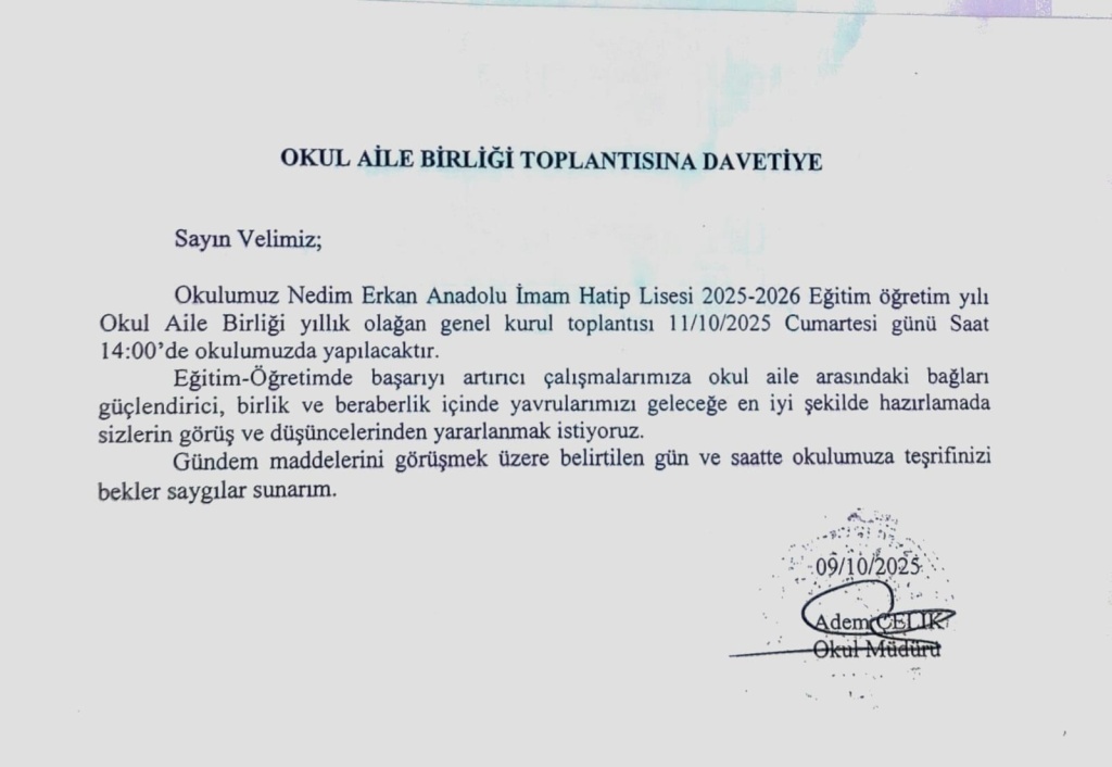 11/10/2025 CUMARTESİ SAAT :14.00 TE OKUL AİLE BİRLİĞİ TOPLANTIMIZA TÜM VELİLERİMİZİ BEKLERİZ.